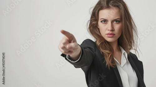 Confident young woman in black suit pointing directly at camera with a serious expression against a light gray background. She exudes determination and authority, reflecting assertiveness and focus