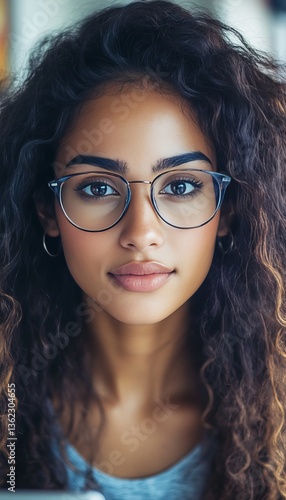 Confident Young Woman Natural Beauty, Curly Hair, and Glasses in a Captivating Portrait.