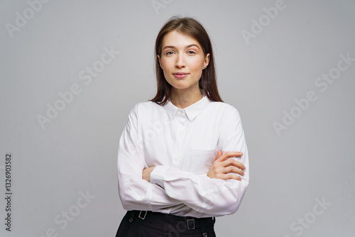 Confident young woman poses with folded arms in a neutral background, exuding professionalism and poise