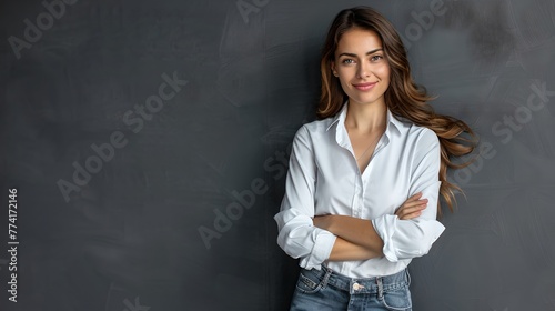 Confident young woman smiling in casual wear, standing with arms crossed on a gray background. Perfect for lifestyle content. AI