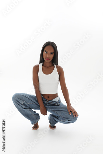 Confident young woman with dark skin isolated over white background. Vertical.