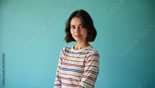 Confident young woman with short black hair posing casually with a gentle smile against a light blue studio backdrop