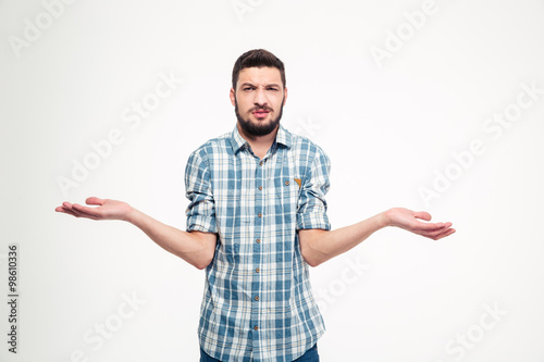 Confused annoyed young man with beard holding copyspace on palms