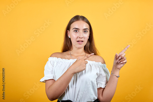 Confused attractive young woman isolated on orange background in studio pointing aside with opened mouth, shocked in casual white shirt. People sincere emotions, lifestyle concept.