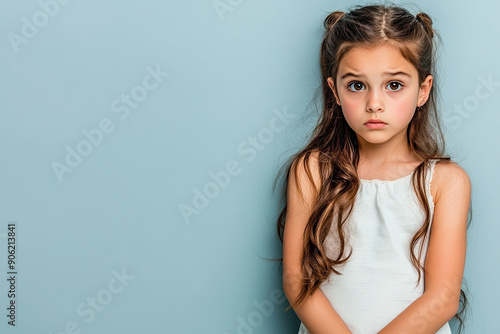 Confused expression model shoot, child looking puzzled wide eyed raised eyebrows expressive photoshoot, clean background, generated ai