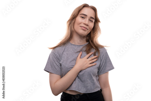 Confused fair-haired teenage girl in a gray T-shirt on a white background