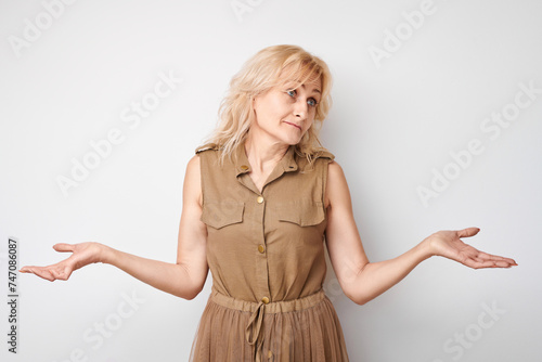 Confused middle-aged woman shrugging her shoulders in uncertainty, isolated on a white background.