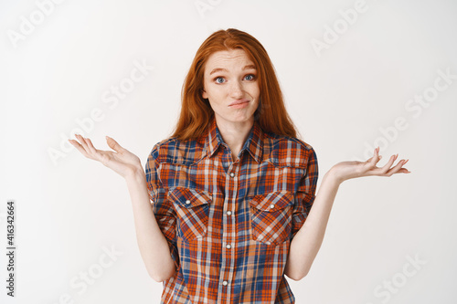 Confused redhead girl dont know anything, shrugging and smirking clueless, standing unaware against white background