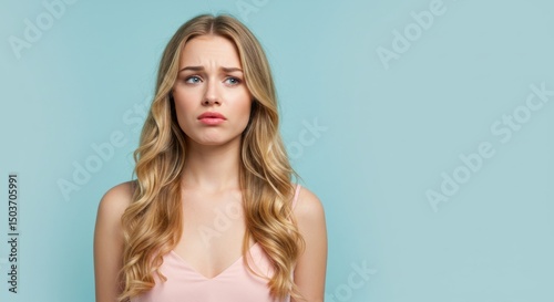 Contemplative blonde woman on a pastel background shows thoughtful expression