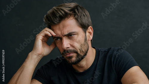 Contemplative Man: A pensive portrait of a man lost in thought, his hand resting thoughtfully against his head. The image evokes a sense of introspection and quiet contemplation.