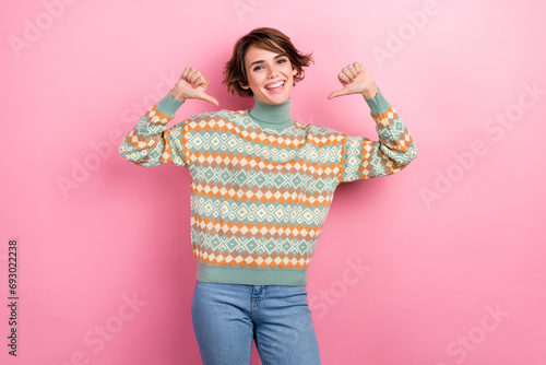 Content photo of young attractive girl brown hair trendy winter turtleneck print indicate fingers herself isolated on pink color background