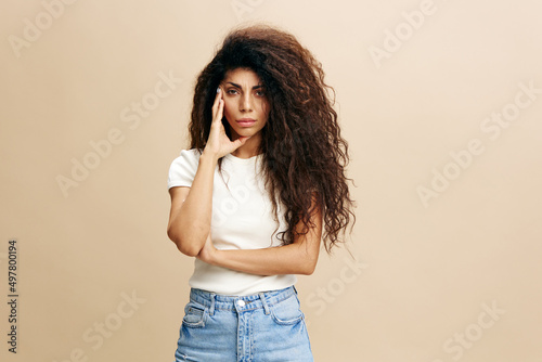 COOL OFFER. Confident serious beautiful curly Latin female in white t-shirt touch cheek. Fashion woman portrait. Studio shoot over beige background. Copy space, free place for design ad