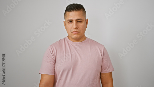 Cool young hispanic man poised in a relaxed lifestyle portrait, standing with a serious expression, looking at the camera. isolated cutout against a white wall.