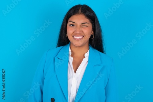 Coquettish Young latin woman wearing blue blazer blue background smiling happily, blinking at camera in a playful manner, flirting with you.