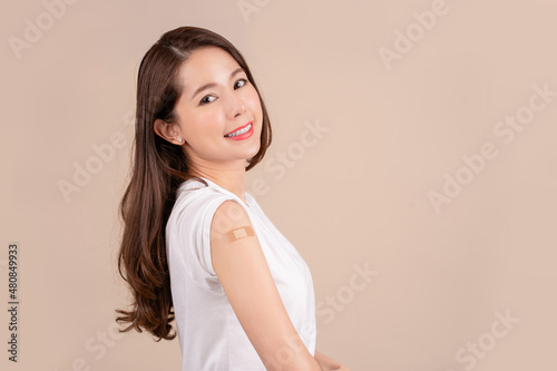 Coronavirus vaccination advertisement. Happy Young beautiful asian woman getting vaccinated showing arm with plaster bandage after Covid-19 vaccine injection posing on background, Smiling to camera.