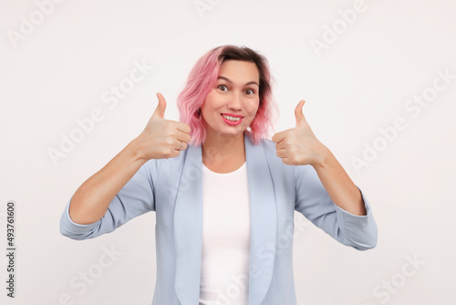 Corporate people. Smiling successful businesswoman showing thumbs up with stretch out hands, looking pleased, satisfied with good result, standing in suit over white background