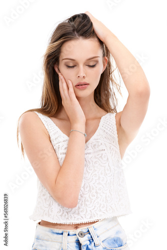 Cosmetics, fashion and woman with confidence, style and long hair on a white background in studio. Beauty, peace and stylish model with fashionable clothes for femininity on a studio background