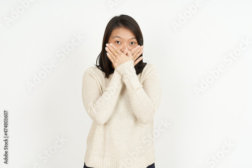 Covering mouth with hands of Beautiful Asian Woman Isolated On White Background