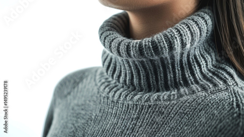 Cozy gray ribbed knit turtleneck sweater. Stylish and warm long-sleeve top for women.