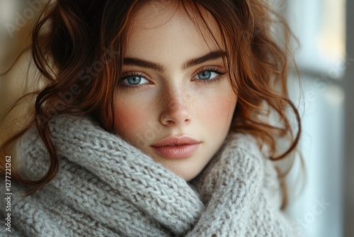 Cozy portrait of beautiful young woman in chunky knit sweater looking at camera with soft natural light