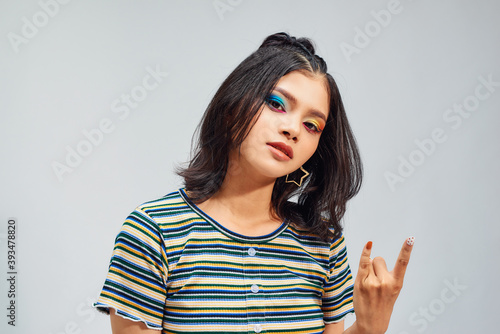 Crazy beautiful rock Girl. Punk is not dead. Attractive cool young woman making horn sign hand gesture.