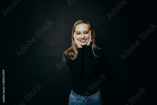 Crazy day. Waist up portrait of beautiful shocked young woman wears black turtleneck sweater, looks with a puzzled expression as hears something unexpected, has problems or troubles in life. Tiredness
