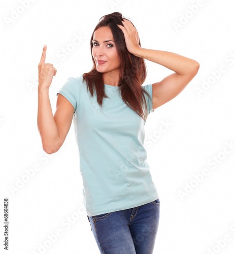 Crazy hispanic female pointing up her finger