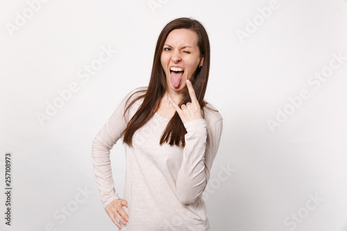 Crazy young woman in light clothes showing tongue, horns up gesture, depicting heavy metal rock sign isolated on white wall background. People sincere emotions lifestyle concept. Mock up copy space.