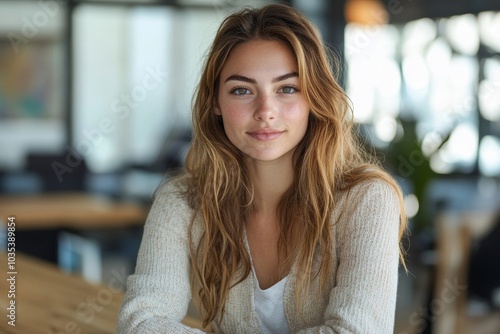 Creative businesswoman sitting on a conference table in an office, Generative AI
