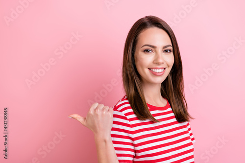 Cropped photo of young woman happy positive smile point thumb empty space sale promo advice ad isolated over pink color background