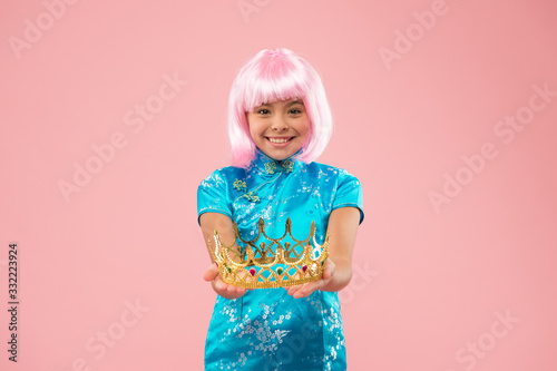 Crown she deserves. concerns chinese coronavirus. Golden diadem or tiara. Coronate symbol. Beauty princess in japanese style. Fashion accessories and style. Luxury look. Winning pageant crown