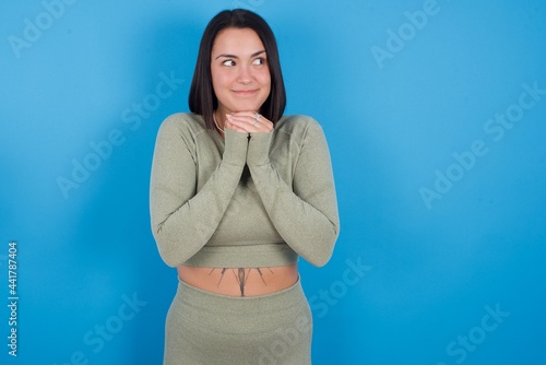 Curious Young beautiful sporty girl standing against blue background keeps hands under chin bites lips and looks with interest aside.
