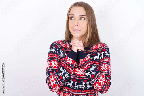 Curious Young caucasian girl wearing christmas sweaters on white background keeps hands under chin bites lips and looks with interest aside.