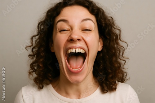Curly haired woman screaming with closed eyes and mouth wide open, expressing intense emotion against a neutral background