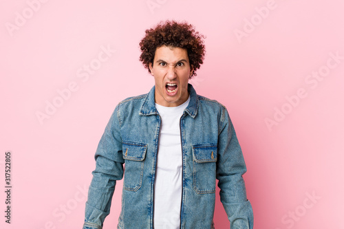 Curly mature man wearing a denim jacket against pink background screaming very angry and aggressive.