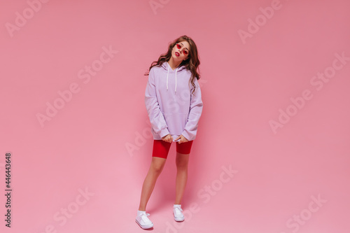 Curly woman in red cycling shorts and purple hoodie looks into camera. Charming girl in sunglasses poses on pink background.