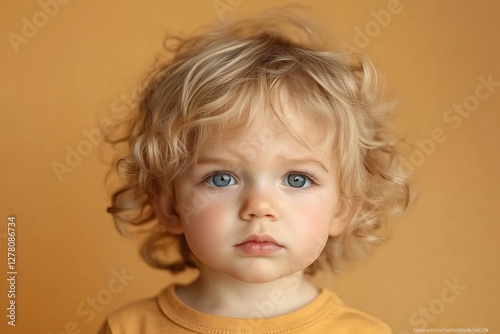 Curly-haired child with blue eyes gazes thoughtfully against a warm orange backdrop