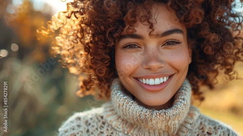 Curly-haired lady smiling warmly in an autumn setting wearing a cozy knitted sweater