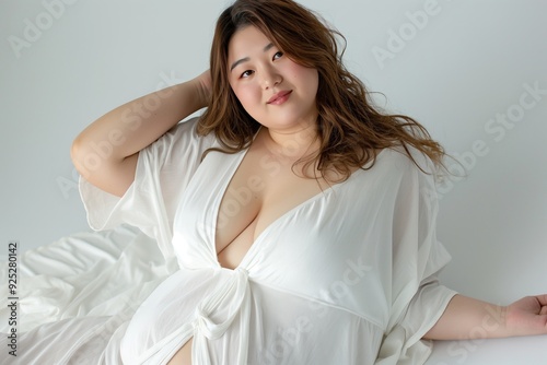 Curvy Asian model in white nightgown, confident in studio. Concept about lifestyle and body positivity