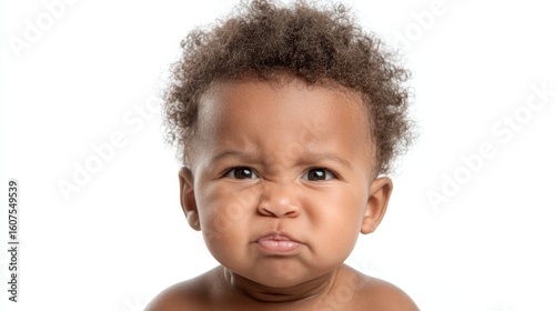 Cute african american infant displaying emotional expression with pouting lips and furrowed brows against minimalist white background