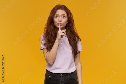 Cute, attractive woman with long ginger hair. Wearing pink t-shirt. People and emotion concept. Showing silence sign, asks to be quiet. Watching at the camera, isolated over orange background