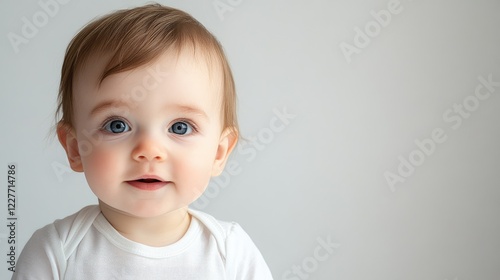 Cute baby portrait with bright blue eyes and light brown hair against a soft white backdrop in studio photography setting.