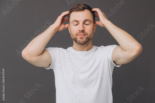 Cute bearded man massaging his scalp on gray background in studio, beauty and care concept