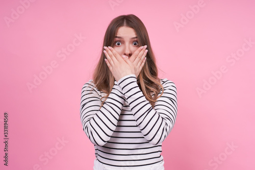 Cute beautiful girl covered her mouth with her hands, calling for silence