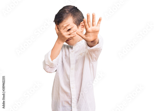 Cute blond kid wearing elegant shirt covering eyes with hands and doing stop gesture with sad and fear expression. embarrassed and negative concept.