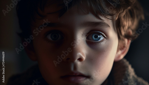 Cute boy with brown eyes smiling, looking at camera happily generated by AI