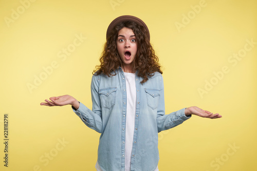 Cute brunette woman with curly hair got surprised, isolated over yellow background