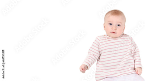Cute caucasian baby girl, looking at camera, white striped clothes isolated. Copy space for text, banner.