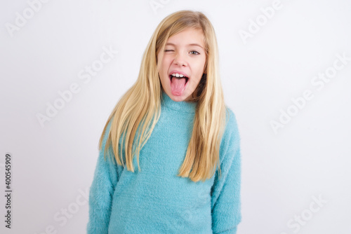 Cute Caucasian kid girl wearing blue knitted sweater against white wall with happy and funny face smiling and showing tongue.