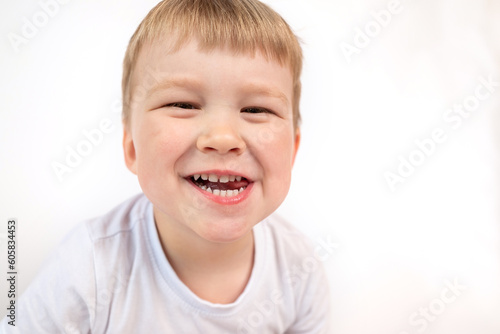 Cute child shows his baby white healthy teeth and open mouth close-up. The concept of oral hygiene, healthy teeth